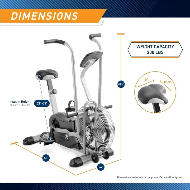 Featured Foam Covered Handlebars, Fan Exercise Bike with a Pair of Double-Action Exercise Arms, Transport Wheels for Easy Moving, Adjustable High-Density Foam Seat Foam Covered Handlebars, Fan Exercise Bike with a Pair of Double-Action Exercise Arms, convenient Moving Transport Wheel, adjustable High-Density Foam Seat Color Black Power Battery Powered Product Recommend Use Indoor Commodity Weight 79 Lbs Material Alloy Steel Resistance Mechanism Air Product Dimensions 46 Inches Deep X 24 Inches Wide X 48.5 Inches Tall Maximum Weight recommended 300 Pounds